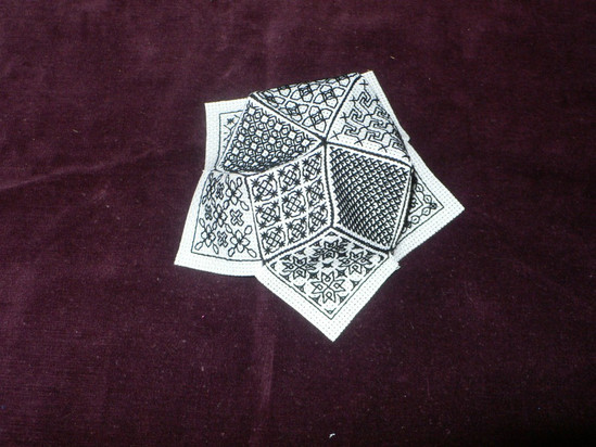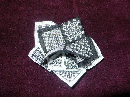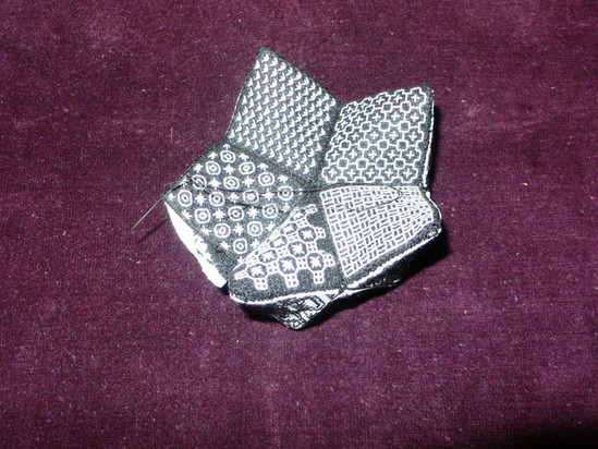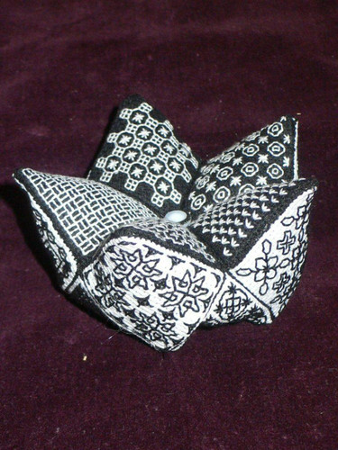 Если Вы соедините "чёрную" звёздочку таким же образом (уголок бокового квадратика к точке соединения пары), то получите пузатую пятиклинку. Останется только стянуть противоположные центры верха и низа пуговицей, чтобы заиметь подушечку. Для лотоса нужен следующий шаг.