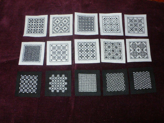 1) Сначала необходимо подобрать интересующие мотивы для вышивания. Это могут быть и цветочки, и микро-сюжеты, и буквы. Я остановилась на блэкворке, ибо давно хотела опробовать этот вид вышивальной техники. Важно, чтобы все мотивы были одинакового размера, например, 20×20 крестиков (как у меня).